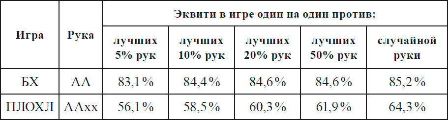 В безлимитном холдеме карманные тузы являются «монстром», стартовой рукой, доминирующей над всеми остальными. В пот-лимитной омахе хай-лоу единственной схожей по силе рукой являются двухмастные A-A-3-2, и получить такую руку удаётся редко. Из таблицы 2.1 можно видеть, что в пот-лимитной омахе хай-лоу карманные тузы по-прежнему являются очень сильной рукой, но уже далеко не такой сильной, как в холдеме.