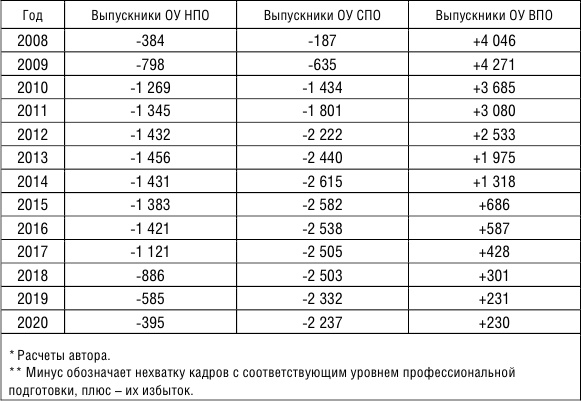 > нехватка выпускников с начальным и средним профессиональным образованием и переизбыток выпускников с высшим профессиональным образованием на протяжении всего периода прогнозирования;