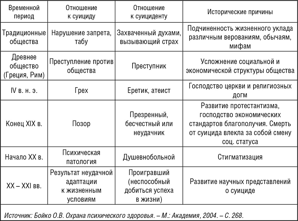 С течением времени отношение общества к феномену суицида изменялось от карательного к сочувствующему. Общая динамика этого процесса представлена в таблице 4 [22].