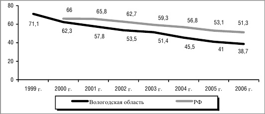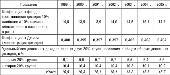 В Российской Федерации ситуация и в 1999 году по этим индикаторам выходила за рамки разумного, превышая все критические точки социальной безопасности (табл. 1.2.1). За 20002006 годы не произошло положительных изменений в динамике данных показателей. Ситуация законсервировалась и стала еще хуже, а если сравнить удельный вес денежных доходов первых двух 20 % групп (40 % населения приблизительно 58 млн. человек) с наименьшими доходами в процентах к общему объему годовых денежных доходов, то увидим, что и здесь ситуация ухудшилась.