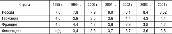 Многолетние данные по промышленно развитым странам говорят о том, что норма отношения средних доходов 20 % населения с наибольшими доходами к средним доходам 20 % с наименьшими доходами составляет 3,54,4 раза. В России же этот показатель постоянно растет: так, в 2004 году он был более чем в два раза выше, чем в европейских странах (табл. 1.2.2).