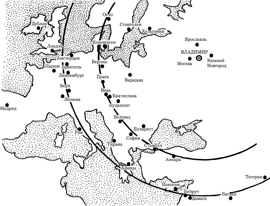 На основе чего я делаю такое заключение? Посмотрите на рис. 1. Вы видите на нём кольца европейских и азиатских столиц вокруг города Владимира. Кольца идут с шагом в 600 км. Первое очень насыщенное столицами кольцо начинается на расстоянии 1800 км от Владимира.