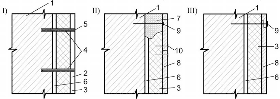 Рис. 1.9. Три варианта конструкций утепления наружных стен крупнопанельных зданий: 1 существующая стена; 2 базальтофибробетонная стяжка; 3 утеплитель; 4 шпонки из базальтофибробетона; 5 анкер из полимерной арматуры; 6 клеевой слой; 7 деревянная рейка; 8 волокнисто-цементные плиты; 9 металлический анкер; 10 шуруп-саморез