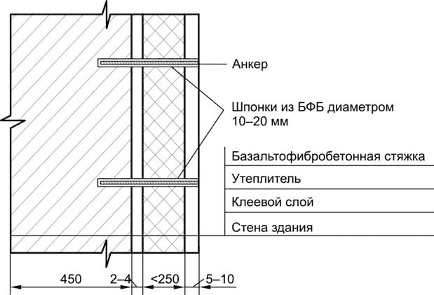 Суть предложенной технологии утепления наружных стен состоит в том, что на поверхность жестких плит из пенополистиролбетона заводского изготовления с одной стороны методом торкретирования наносится базальтофибробетонная стяжка толщиной 510 мм с последующим выравниванием и затиркой, а с другой слой клея типа «КРЕПС» (24 мм). Затем плита устанавливается в проектное положение таким образом, чтобы перекрыть мостики холода в наружных стенах здания, крепится клеем и шпонками из базальтофибробетона армированными полимерными анкерами. Для анкеровки плит в стене здания просверливают отверстия, в которые затем инъецируется базальтофибробетонный раствор и вставляется полимерный анкер (при твердении раствора образуется анкерное крепление в виде шпонки). Предпочтение отдается полимерному анкеру, т. к. металлический подвергается коррозии. Надежность крепления панелей к стене гарантируется результатами испытаний анкеров, которые выдерживают усилие на вырывание: 44,8 МПа при твердении в течение 1 часа; 1012 МПа при твердении через 1 сутки.