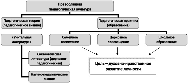 Для этого нам необходимо обратить внимание на то, что православная педагогическая культура, находящаяся на пересечении науки и православной культуры, соответственно включает в себя педагогическую теорию (педагогическое знание) и педагогическую практику, или практику образования. Истоки православной педагогической теории мы находим в так называемой «учительной литературе» (это будет показано нами в данной работе ниже). Позднее, что также будет отражено в работе, теоретико-педагогическое наследие православной культуры выделилось в два направления: святоотеческая мысль, или церковно-педагогическое знание, и научно-педагогическое знание, отраженное в трудах ученых-педагогов, православное мировоззрение которых привнесло свои особенности в трактование многих педагогических явлений. Роль институтов воспитания в православной педагогической культуре выполняют не только семья и школа, но и Церковь, церковное общество. Соответственно педагогическая деятельность в контексте православной культуры реализуется в семейном воспитании, церковном просвещении и школьном образовании.
