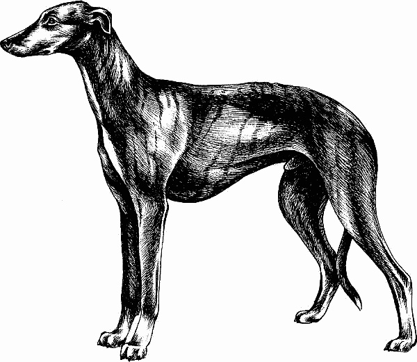 Английская борзая грейгаунд (рис. 4) герой скаковых стадионов. Он относится к наиболее резвым борзым. Грейгаунд обладает удивительной энергией и неутомимостью. Его прямолинейные, длинные скачки позволяют развить огромную скорость. Его называют также английской борзой, так как разведение породы уже на протяжении долгих столетий связано с Англией. Туда он попал еще в раннем средневековье и вскоре стал излюбленной стайной собакой, применявшейся для травли зверей. Предки нынешнего грейгаунда происходят из северной Африки. В древнеегипетских скульптурах мы встречаемся с собаками, которые очень похожи на него. Английские собаководы придали ему лишь более нежный костяк, большую породность, благородство линий и дали название грей (серый).