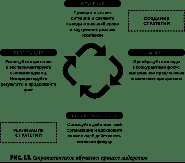 Как показано на рис I.3, процесс состоит из четырех связанных между собой этапов обучение, направленность, согласование и реализация, которые развиваются на основе друг друга и (в качестве пятого этапа) повторяются, образуя непрерывный цикл. По сути, стратегическое обучение является моделью «от вывода к действию». Задача руководителей повторять его снова и снова с тем, чтобы организация постоянно училась на собственных действиях и результатах изучения среды и затем соответствующим образом улучшала свои стратегии. Стратегическое обучение сочетает в себе стратегию, обучение и лидерство в едином процессе.