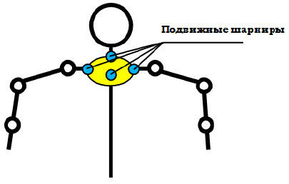 Тело человека является от природы подвижным и очень гибким, и его нельзя сравнивать с жесткими конструкциями. Строение человеческого тела нами рассматривается как упругая и подвижная модель, использующая основные суставы в качестве подвижных шарниров, имеющих несколько степеней свободы в тех границах, которые доступны данному человеку в пределах его гибкости (рис. 1).