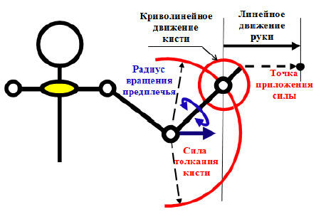 Кистевые удары лучезапястного сустава. В механике кистевого удара лежит вращение рычага кисти с центром вращения, проходящим через лучезапястный сустав (рис. 3). В зависимости от разворота рычага кисти, удары могут производиться по круговым траекториям вовнутрь наружу, а также линейным перемещением кулака или кисти до точки приложения силы. Кистевой удар усиливается вращательным движением предплечья. Преимущество кистевого удара в его непредсказуемости, большой скорости и легкой управляемости. Удар может выполняться с любой точки пространства и легко перенаправляться по траектории движения кисти.