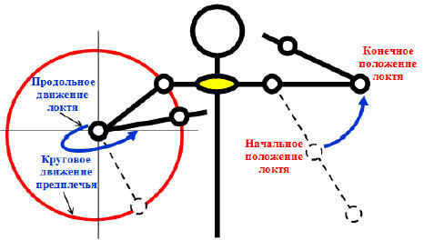 3. В кинематической модели человека выделяются опорные ударные элементы (кисть, локоть, плечо).