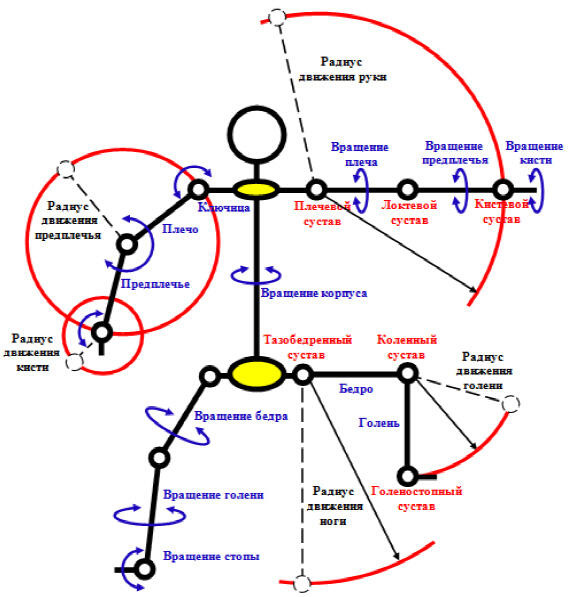2. Кинематическая модель человека составляют простые и сложные рычаги, соединенные суставными организациями, с различной степенью свободы.