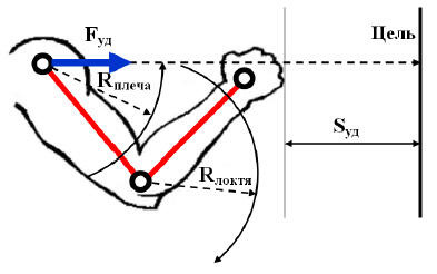 Основным двигателем удара является плечо. В задачу плеча входит проведение инерции путём перекатывания снизу вверх волны, создаваемой и поддерживаемой последовательным действием крупных суставов тела. Предплечье, разгоняя удар, ведет его по направлению, задаваемому плечом. Всегда надо помнить, что не кулак таскает за собой предплечье, а рука вбивает кулак в цель. Поэтому, если в разгоне удара не участвует локоть, тяжесть руки становится невольной обузой, и кулак не столько вбивается в предмет, сколько растягивает висящую на ударе руку. Толкателем кулака и предплечья выступает локоть. Важнейшей задачей которого, является создание плоскости удара. Если локоть остаётся в одной плоскости с плечевым посылом, то и кулак не покинет эту плоскость, если же локоть проваливается под вектор кулак будет направлен снизу вверх и выполнит апперкот, а при поднятии локтя кулак, соответственно, пойдёт по дуге сверху вниз. Кулак это средство пробивания, и ничего более. Он опирается на лучезапястный сустав, являющийся самым слабым звеном во всей конструкции удара. Лучезапястный сустав способен подломить удар, а, поскольку кулак набирает уже максимальное ускорение в развитии действия, то и травмировать связки кулака. Это единственный элемент во всей системе, доказывающий, что по природе своей необходимо бить не кулаком, а ладонью. Однако лучезапястный сустав имеет свою ценность для построения удара. Он шарнир, который позволяет подкрутить удар по осевой линии. В этом и заключается его главное полезное свойство. Складывается схема: