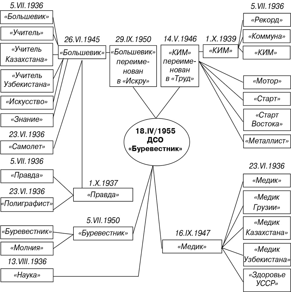 Здесь следует подчеркнуть, что в 19361956 гг. ДСО «Буревестник» объединяло работников профсоюзов госторговли, книжной торговли, потребкооперации, центра общественного питания и внешней торговли. Помимо ДСО «Буревестник» в 1936 г. были созданы и другие добровольные спортивные общества, организованные по отраслевому принципу.