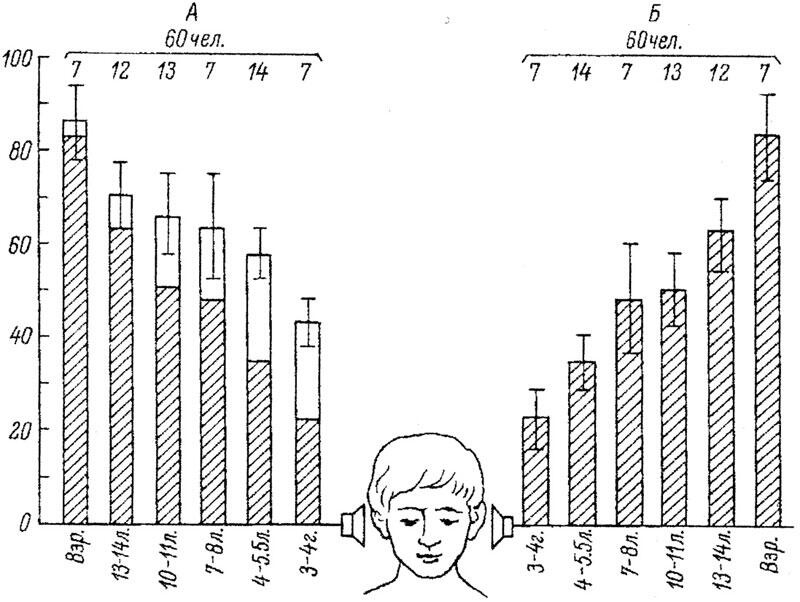 Рис. 2. Функциональная асимметрия мозга проявляется в преимуществе правого уха (т. е. левого полушария) при восприятии слов. Средние различия дихотического восприятия слов у людей разных возрастных групп для правого (А) и левого (Б) уха.