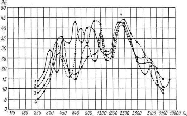 На рисунке представлены наложенные друг на друга спектры голоса известных мастеров вокального искусства: 1 Ф. Шаляпина (гласн. А, нота mi1), 2 П. Лисициана (гласн. А, нота sol1), 3 Э. Карузо (гласн. О, нота la1, 4 Г. Зобиана (гласн. А, нота la1). Хорошо видно, что ВПФ, отмеченная стрелкой, у баса, баритона и двух теноров имеет большой уровень энергии и практически совпадает по своему расположению на шкале частот (см.: Морозов, 1977).