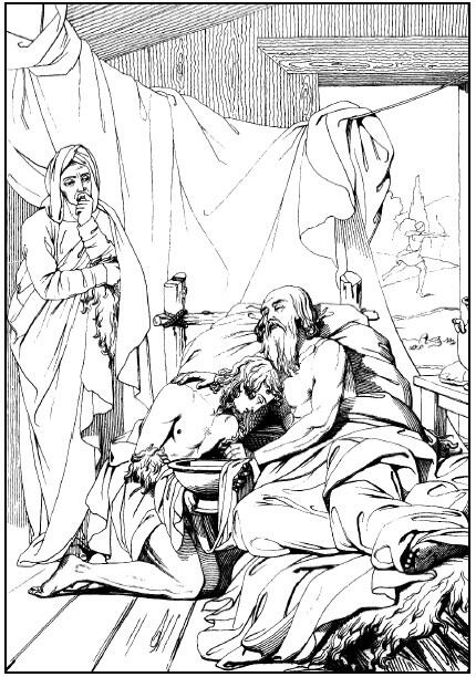 Не успел он далеко уйти от родительского дома, как наступила ночь, и ему пришлось одному ночевать в поле. Он положил себе камень под голову и уснул. Во сне он увидел лестницу, высотой до неба, а по ней Ангелы восходят и нисходят, наверху же ее стоит Сам Господь и говорит Иакову: «Я Бог Авраама и Исаака. Не бойся: землю, на которой ты лежишь, Я дам тебе и потомству твоему; потомства же у тебя будет так много, как песку на земле, и в Семени твоем благословятся все племена земные». Здесь под Семенем, или Потомком его, чрез Которого благословятся все народы, разумеется Спаситель. Лестница же, соединявшая небо с землею, предвещала Божию Матерь, чрез Которую Сын Божий сошел на землю для спасения людей. Пробудившись от сна, Иаков принес Богу благодарственную жертву, возлив на камень елей, и назвал это место Вефилем, что значит дом Божий. После этого с надеждой на помощь Божию он спокойно продолжал свой путь в Месопотамию[3]. Через несколько лет Иаков благополучно возвратился оттуда к отцу своему в землю Ханаанскую с большой семьей и имуществом, причем радостно встретил его на пути Исав, давно не видавший брата своего. Иаков сделался родоначальником народа израильского, или еврейского.