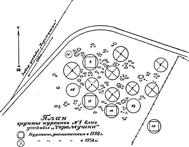 План расположения группы курганов 1 в усадьбе Знаменское Черёмушки при раскопках 1928 и 1938 гг.