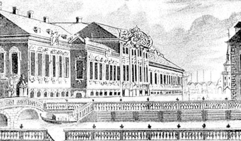 Временный деревянный Зимний дворец императрицы Елизаветы Петровны на углу Невского проспекта и набережной Мойки. С гравюры Ф. Т. Внукова по рисунку М. И. Махаева, 1761 г.