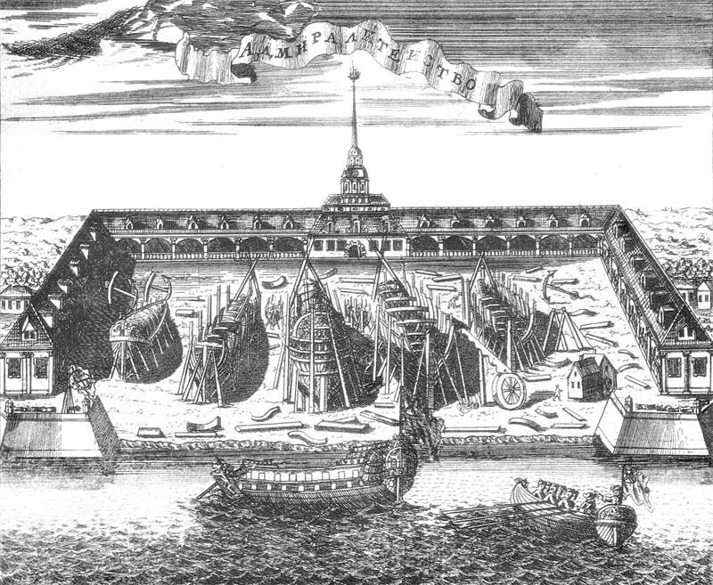 Значение Адмиралтейства как верфи (после очередных побед в боях со шведами) неуклонно возрастало. В 1706 году с ее стапелей торжественно спустили на воду двух российских первенцев 18-пушечный военный корабль «Прам» и яхту «Надежда». Особый подъем на верфи Адмиралтейства отмечался после блистательной победы русских войск над шведами в Полтавском сражении. В честь этого великого подвига на стапелях Адмиралтейского двора заложили лидер военно-морских сил Российской империи 54-пушечный линейный флагманский корабль «Полтава». Строителем первого русского линкора стал корабельный мастер Главного Санкт-Петербургского Адмиралтейства Петр Михайлов, или, иначе, император Петр Великий, при непосредственном участии самородка русского судостроения корабельного мастера Ф. М. Скляева.