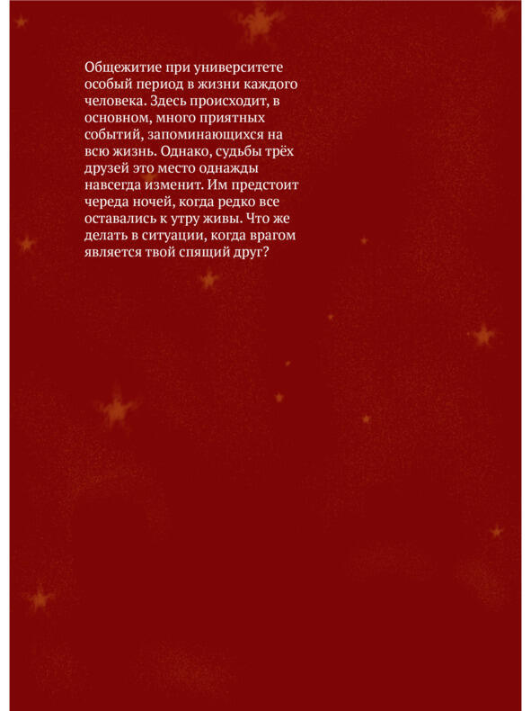 Переглянувшись друг с другом в последний раз, они оба выскочили на лестничную площадку и побежали каждый на свой этаж. Они решили, что на один, где жила Мэлани, пойдёт Дэвид. Ситуация была, мягко говоря, не из приятных. Приближаясь к её комнате в общежитии, он ни на секунду не переставал надеяться, что всё обойдётся. В их глазах чувствовался как страх, так и переживание за свою лучшую подругу. Когда они смотрели друг другу в глаза и спешно обсуждали план действий, они словно смотрели в зеркало, понимая, что их чувство страха от того, что может ожидать внизу, взаимно. Спустившись на один этаж, Вэйланд стал открывать дверь и ужаснулся увиденному. Какая-то тёплая красная жидкость оказалась на его руке. В ту же секунду он учуял запах, который связывал его воспоминания с неприятным ощущением болью. Жидкость, будучи совсем свежей, начала стекать с его ладони на пол, и разум Вэйланда, отказывающегося верить в происходящие, всё-таки признал, что это была кровь. Его ярое желание помочь людям и поскорей добраться до них притупилось в ту же секунду. В этот момент Дэвид должен был застать ситуацию куда плачевней. Он добрался до её этажа и уже собирался ускориться, но, остолбенев, увидел аналогичную картину происходящего, как и у его лучшего друга. Лужи крови, следы от волочения на полу, окровавленные отпечатки рук на стене и непонятные остатки чего-то человеческого, разбросанные по всему коридору. Дэвид от такой жути уже давно унёс бы свои ноги, но такие чувства, как забота, любовь и верность другу, не давали ему повернуть назад. Он буквально переступал через все эти следы кровавого побоища и аккуратно приближался к концу коридора, где проживала Мэлани. Дэвид очень доверял Вэйланду и рассчитывал на то, что он сделает всё возможное, чтобы помочь пострадавшим студентам. Так был рассчитан их план. Он взамен потребовал позаботиться об их лучшей подруге. Была глубокая ночь. Часа три или четыре. На этажах как-то странно, с перебоями, работало освещение, и ребята шли иногда наугад. Вэйланд всегда был большим оптимистом, и даже в такой страшной ситуации он верил, что Дэвида он оставил не зря и всё образуется. Дойдя до комнаты Мэлани так быстро, как позволяло его хладнокровие, он ни на миг не успокоился. Услышав истерический плач соседок по комнате, которые успели забежать в ванную и туалет, он понял, что дело дрянь. Мэлани там он не обнаружил, а рассмотреть комнату ему не позволило дикое желание найти её как можно скорей. Может, это было и к лучшему, так как трупов с вывернутой шеей Дэвид ещё ни разу не видел. Тем временем Вэйланд старался помочь уже третьей жертве какой-то таинственной напасти и был уже почти на лестничной площадке, пройдя весь этаж. Скорую и полицию они вызвали почти сразу, но, услышав слово «общежитие», они как-то не особо ринулись выезжать. Как бы сейчас ни поступил Дэвид, всё уже было предрешено, когда они решили действовать по их плану. Мэлани, заканчивая с будущим трупом, размазав его голову о кафельную стену, ждала его этажом ниже, и она словно чувствовала, что он придёт к ней именно сейчас и именно на эту кухню. Что, в принципе, и произошло спустя секунд десять. На небе стояла ярчайшая луна, которая показывала нам полный контур своей окружности. Это была ночь, в которой она находилась в четвёртой фазе, или, иначе говоря, в самой жёсткой фазе для наши