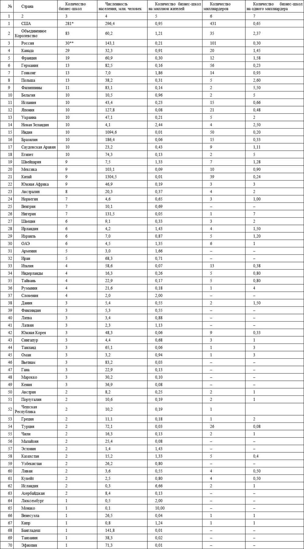 Как видно из данных табл. 1, США и Соединенное Королевство являются и формальными мировыми лидерами по числу аккредитованных бизнес-школ. Публикуемые несколько раз в году рейтинги, во-первых, призваны убедить претендентов, что именно названные ими школы являются лучшими в мире, во-вторых, такие рейтинги служат искусным маркетинговым инструментом, под разными предлогами меняя местами разные школы бизнеса, тасуя их как колоду карт в руках профессионального игрока, в результате всемирно известная бизнес-школа в Лозанне (Швейцария) оказывается то на четвертом месте в мире, то не входит в тридцатку лучших школ мира. Поэтому, отдавая должное объективно высокому уровню методологии и учебным программам англо-американских бизнес-школ, ни в коем случае нельзя забывать об их социальной направленности и о том, что вся мировая система этих школ служит отражением сложившейся глобальной системы конкуренции, как межстрановой, так и межкорпоративной. Принимая это во внимание, теперь можно прокомментировать некоторые данные табл. 1, а затем ответить на поставленный выше вопрос.