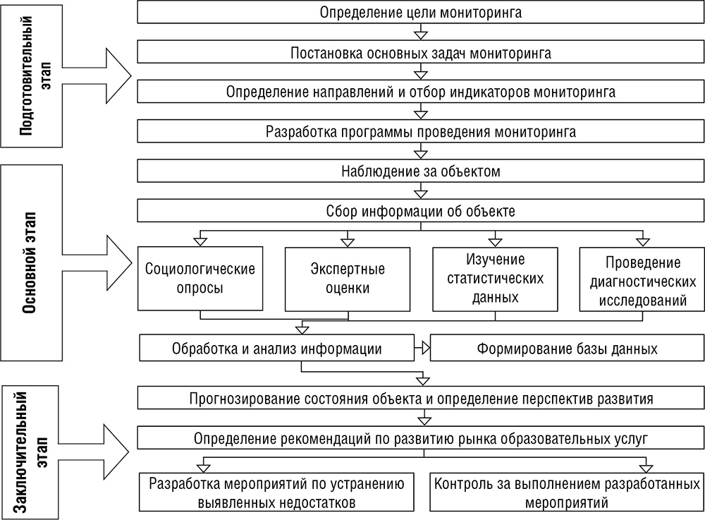 На первом (подготовительном) этапе определяются концептуальные основы мониторинга цели, задачи, объект, предмет, основные направления, которые в дальнейшем систематизируются в программе исследования. На данном этапе работ важное место занимает формирование перечня индикаторов, по которым будет проводиться мониторинг. Данный перечень должен полностью отвечать целям и задачам исследования; содержать показатели, отражающие эффективность проводимых в сфере образования модернизационных мероприятий и применяемые в государственных и ведомственных целевых программах; отличаться разнообразием источников данных от официальной статистики до результатов социологических опросов и интервью.