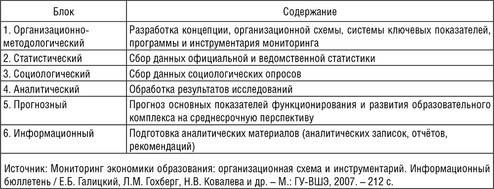 В ходе данного мониторинга может быть реализована целая система широкомасштабных социологических и статистических исследований, охватывающих весь комплекс образовательных учреждений от детских садов до вузов. Методологическая структура модели мониторинга, проводимого НИУ ВШЭ, включает в себя шесть блоков: организационно-методологический, статистический, социологический, аналитический, прогнозный и информационный, каждому из которых соответствует свой инструментарий и набор индикаторов (табл. 1.1.2).