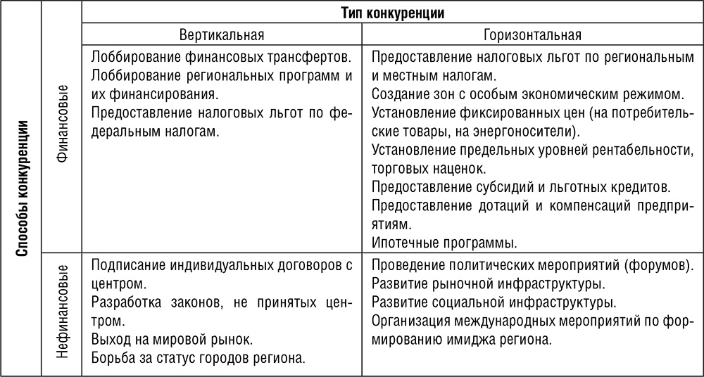 В итоге матрица межрегиональной конкуренции позволяет провести сопоставление вертикальной и горизонтальной конкуренции по типу и способу воздействия (табл. 1.1) [73].