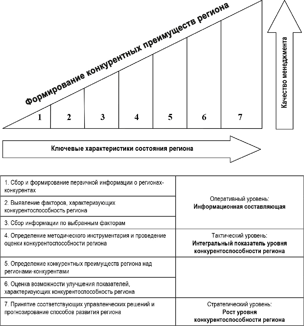 Следует отметить, что формирование конкурентных преимуществ региона происходит под влиянием ключевых характеристик его состояния и качества менеджмента. По нашему мнению, этот процесс имеет три уровня (рис. 1.5):