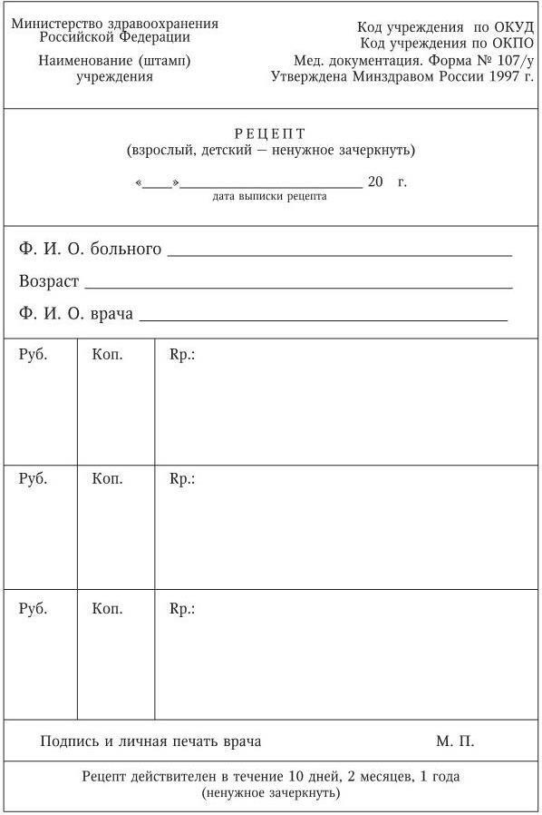 Наконец, существует еще одна форма рецептурного бланка (форма 107/у) для выписывания лекарств групп «Varia» («простых препаратов»), а также препаратов групп ядовитых и сильнодействующих, не входящих в специальные ограничивающие списки.