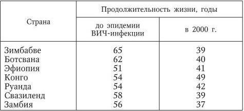 Биотерроризм поставил на повестку дня, казалось бы, забытую проблему особо опасные инфекции (оспу, из бактериальных чуму, сибирскую язву и др.). В разные годы высказывалось мнение об угрозе для человечества таких инфекционных болезней, как ВИЧ-инфекция, новый вариант болезни Крейтцфельдта Якоба (коровье «бешенство»), грипп птиц. Во всяком случае, уже сегодня последствия ВИЧ/СПИДа привели к появлению тяжелых политических и экономических проблем, к существенному сокращению продолжительности жизни в центре ее распространения в странах Африки, расположенных южнее Сахары (табл. 1).