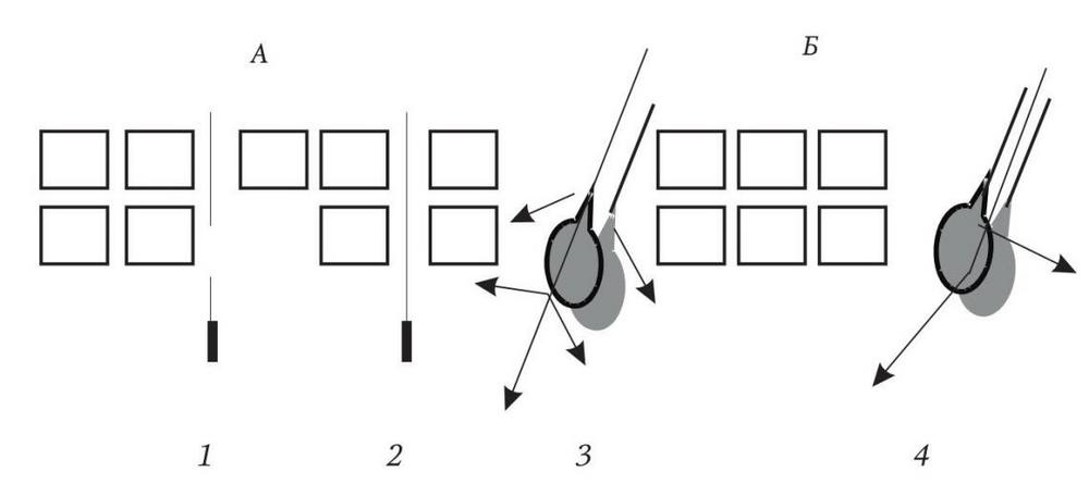А трансдермальный: 1 межклеточный; 2 трансцеллюлярный; Б через поры: 3 трансгладулярный (через стенки фолликул и протоки сальных и потовых желез); 4 трансфолликулярный