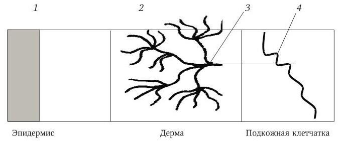 1 роговой слой; 2 капиллярный слой; 3 сеть капилляров; 4 кровеносный сосуд