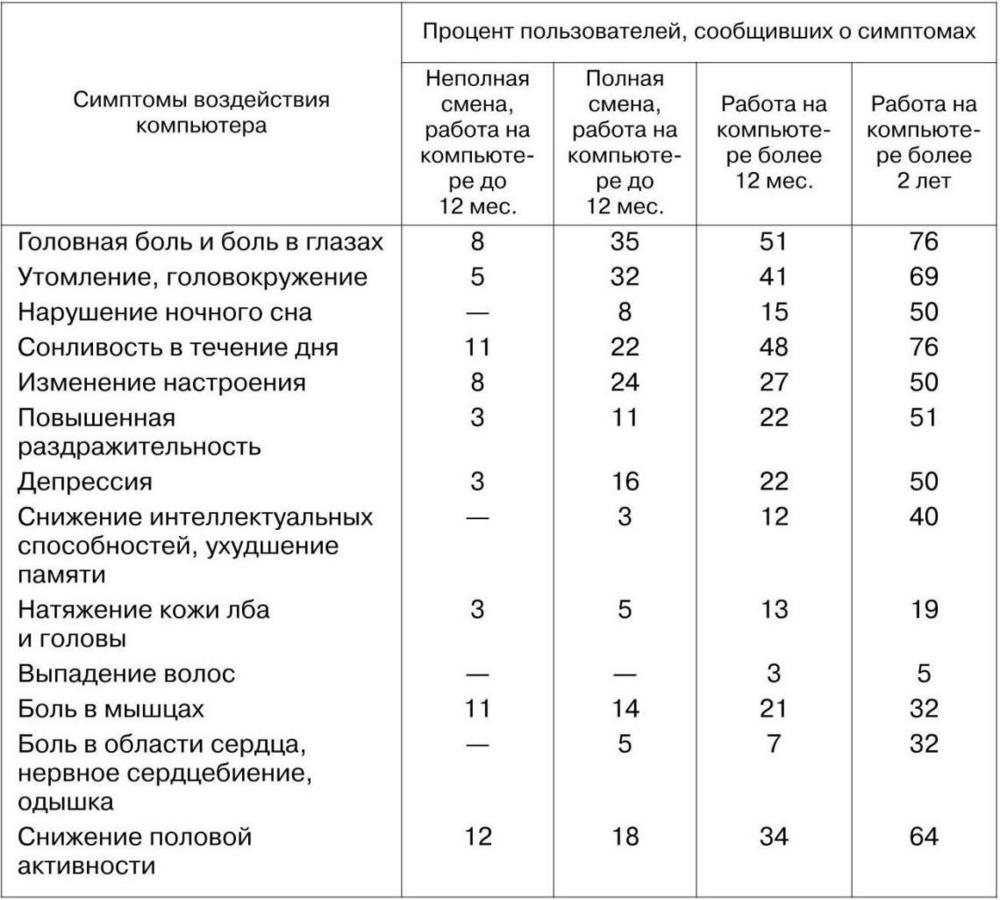 Впечатляют результаты медико-биологических исследований воздействия персональных компьютеров на профессиональных пользователей, проведенных Российским НИИ охраны труда (Демирчоглян Г. Г., 1997), которые представлены в табл. 1.