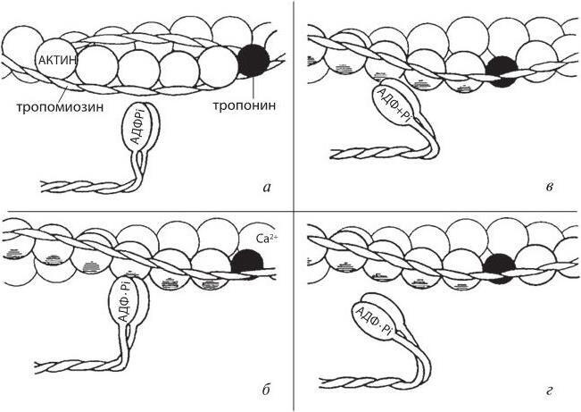 а тонкий филамент состоит из трех протеинов. Его основу составляет актин. В состоянии расслабления миозинчувствительный сайт молекулы актина заблокирован тропомиозином. Когда кальций присоединяется к тропонину, последний претерпевает конформационную перестройку, в результате которой становится возможным взаимодействие актина и миозина; б присоединение головки миозина к актину; в скольжение тонких и толстых филаментов относительно друг друга. В результате гидролиза молекулы АТФ образуются АДФ и неорганический фосфат Pi; г присоединение новой молекулы АТФ к головке миозина