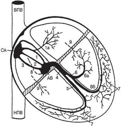 ВПВ верхняя полая вена; НПВ нижняя полая вена; штриховка фиброзная ткань между миокардом предсердий или желудочков; СА синоатриальный узел; АВ атриовентрикулярный узел.