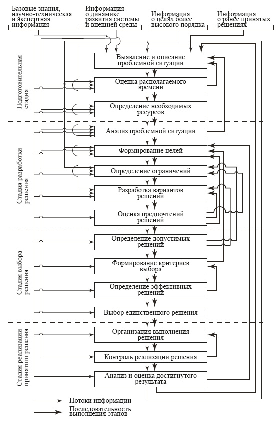 Управленческое воздействие на объект управления осуществляется в форме принятия и реализации управленческих решений. С точки зрения технологии процесс управления представляет собой множество управленческих решений, находящихся на разных стадиях подготовки, принятия и реализации. Основные этапы этого процесса для сложных многокритериальных управленческих решений представлены на рис. 2 [119, с. 127]. При этом используется самая разнообразная информация, все возрастающая часть которой в настоящее время представлена в электронной форме. Принятие и реализация значительной части управленческих решений связаны с изданием соответствующих документов.