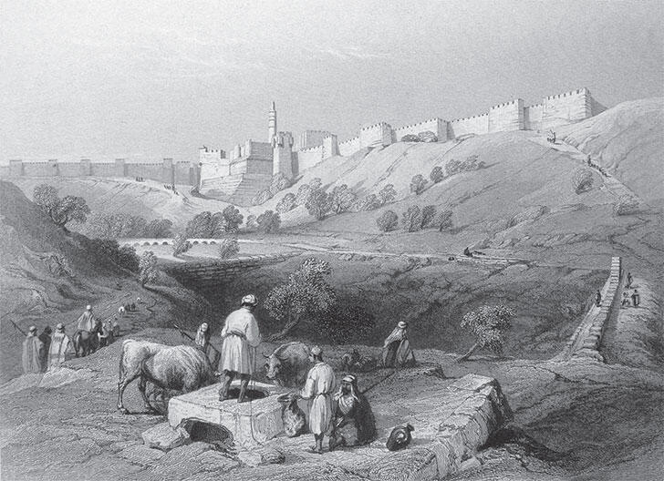 Медленно подвигались мы навстречу чарующему видению. Глаз впивался во все, что мог различить. Но различал он пока немногое. Длинная и высокая, темная стена с двумя массивными башнями посередине закрывала собою все. Башни сторожили западный вход в город, так называемые Яффские ворота, хорошо известные свету по рисункам. Они должны примыкать к Замку Давидову, но и замок вместе с городом не виден был нам; напрасно также взор искал гор Сионской и Элеонской. Все, что возвышалось над окраиной стены, было два-три минарета, два-три плоских купола, и какое-то круглое здание новой постройки. В отдалении, правее Иерусалима, чернелось на возвышенности какое-то большое здание, окруженное садом, единственный предмет, коим оживлялась мертвая окрестность. Сначала я счел его за Вифлеемский храм, обманутый малым сходством, но расстояние до него, по глазомеру, не больше пяти-шести верст, обличило меня в грубой ошибке. По тому же направлению, но ближе к городу, лежало обширное кладбище турецкое со множеством памятников, из коих некоторые имели вид малых храмов с куполом. Западнее кладбища виделась огромная четыреугольная яма, высеченная в скале и служащая водоемом городу, как мне объяснили. Влево от нас, чем далее от дороги, тем чаще показывались деревья, большею частию масличные, которые на параллели Иерусалима образовали уже как бы целую рощу, закрывавшую с этой стороны горизонт.