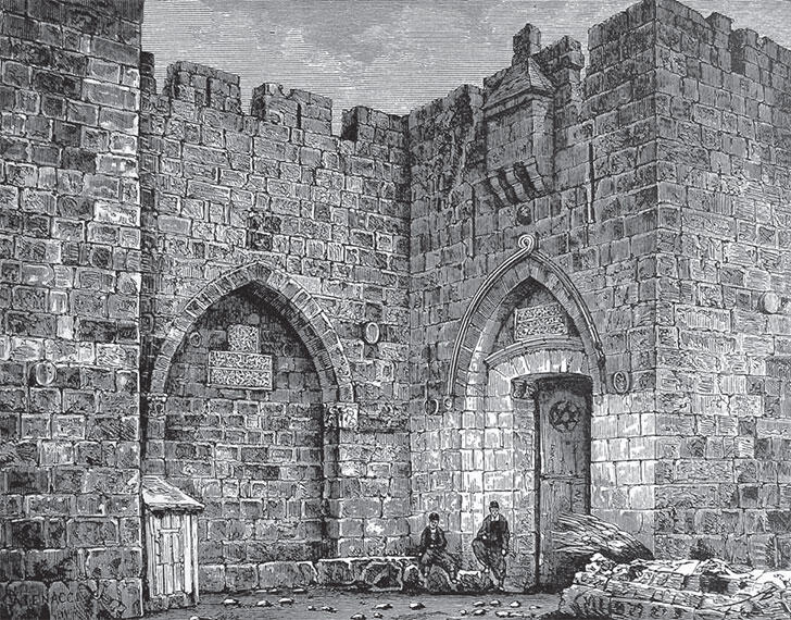 У какой-то загороди мы остановились и оправились, насколько это было возможно, и построились в порядок, которого требовала неотступно следившая за нами субординация. Стройно таким образом мы подъезжали к стенам города, высоким, и крепким, кладенным из серого камня, правильно сеченного. Ежедневно повторяя покаянный псалом Давидов, мы невольно ежедневно молимся о сих стенах. С такою теплотою, воссылаемая здателем Иерусалима, молитва о сих стенах, видимо, было услышана. И теперь ничем не может похвалиться с вещественной стороны Иерусалим, как своими стенами. Кем и когда они воздвигнуты в том виде, как теперь суть, и сохранилось ли что-нибудь в них от времен Давидовых, это, вероятно, останется навсегда не решенным. Наконец перед нами открылись во всем величии твердыни Яффских или Вифлеемских ворот, казавшиеся дотоле безжизненными: местность вдруг оживилась, лишь только мы спустились с последнего холма. Перед воротами кипел народ, то входивший в город, то выходивший из него, то отдыхавший на предпутиях караваном с развьюченными верблюдами. У самых ворот нас встретили караул турецкого гарнизона с левой и ряд нищих с правой стороны. При всем желании нашем въехать во Святой Град в полном порядке и с приличною торжественностью, это не удалось. В самых воротах столпившись и перемешавшись, мы въехали уже как попало в тесную улицу, обставленную низкими каменными домами без окон, представлявшими одну сплошную стену, кое-где пробитую тесными дверцами. Забота о том, как бы не столкнуться со встречными, не потерять из вида своих передовых и не быть смятыми задними, пыль, жар, духота, теснота и шумная разноголосица, все это, соединившись вместе, изгоняло из головы мысль о необыкновенной важности места. После двух поворотов улица привела нас под переброшенную через нее широкую арку. У первых за нею ворот по правую руку была непроходимая толпа пешего и конного народа, в которую, вслед за другими, врезался и мой мул. Мы были у Патриархии.