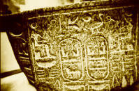Украшение и каменный саркофаг, отделанный резьбой (фрагмент внизу), найденный в одной из гробниц. Национальный музей Египта. Каир.