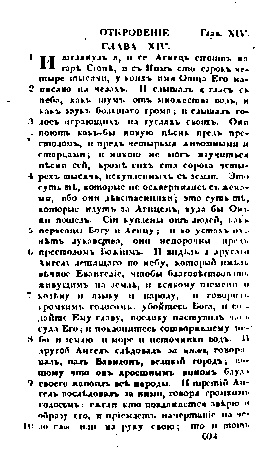 «6 И видѣлъ я другаго Ангела летящаго по небу, который имѣлъ вѣчное Евангелiе, чтобы благовѣствовать живущимъ на землѣ, и всякому племени и колѣну и языку и народу, 7 и говорилъ громкимъ голосомъ: убойтесь Бога, и воздайте Ему славу, поелику наступилъ часъ суда Его; и поклонитесь сотворившему небо и землю и море и источники водъ»[4].