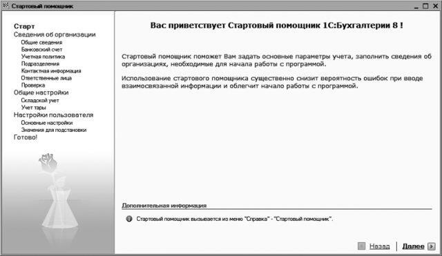 Для ввода исходных данных в рассматриваемой конфигурации предусмотрен специальный механизм, называемый Стартовый помощник. Пользователю предлагается последовательно, в пошаговом режиме ввести все минимально необходимые сведения, причем этот процесс сопровождается подсказками и рекомендациями.