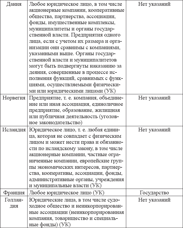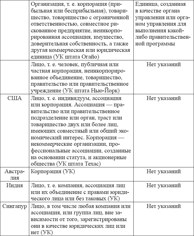 Из табл. 1 видно, что законодатели зарубежных стран именуют юридическое лицо по-разному (корпорация, компания, организация, объединение, предприятие, ассоциация, союз, товарищество, общество, учреждение). При этом все они сходятся во мнении о возможности применения уголовно-правовых санкций как к коммерческим, так и к некоммерческим юридическим лицам, а в некоторых странах (США, Голландия, Бельгия, Польша, Индия, Сингапур[43]) и к организациям, не имеющим статуса юридических лиц.