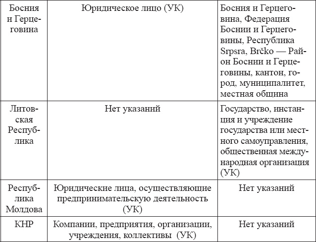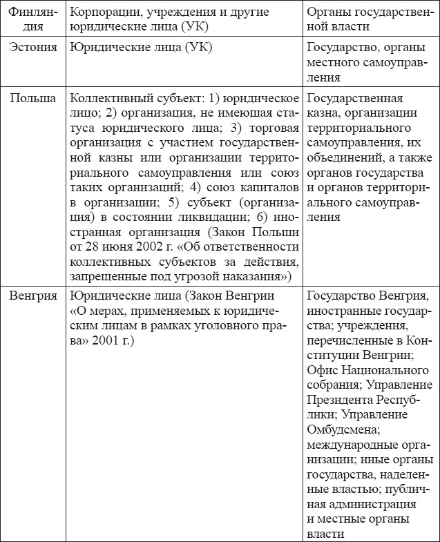 В первую очередь обращает на себя внимание тот факт, что законодательство разных стран неодинаково определяет круг корпоративных образований, в отношении которых допустимо применение мер уголовно-правового характера. При этом в некоторых странах законодатель указывает лишь на те организации, которые, при наличии определенных условий, могут быть субъектами уголовной ответственности, в других указывается только на корпоративные образования, не подлежащие уголовной ответственности, а в третьих приводится перечень и тех и других (см. табл. 1).