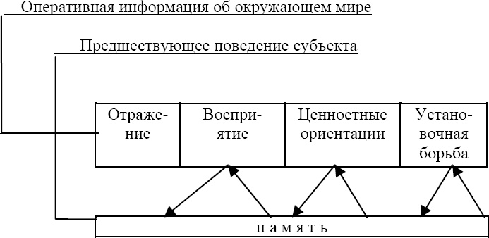 Скорее всего, рассмотрение памяти в качестве процесса по сохранению и воспроизведению опыта является достаточно верным. И. Хофман не совсем точен в другом: во-первых, он считает, что память обеспечивает воспроизведение, но при использовании термина «обеспечивает» автор разрывает память и воспроизведение, придавая им самостоятельный характер, тогда как воспроизведение опыта одна из функций памяти; во-вторых, благодаря указанному, он придал воспроизведению и восприятию статус одноуровневых понятий, чего делать не следовало, поскольку очевидно отнесение восприятия к познанию оперативной, текущей, сиюминутной информации, а воспроизведения к прошлому опыту; в-третьих, как уже выше было продемонстрировано, память обеспечивает не только восприятие оперативной информации, но и иные этапы детерминации психики: ценностные ориентации, установочную борьбу; об этом верно написал Л. Р. Хаббард: «Он (аналитический ум. А. К.) постоянно проверяет и взвешивает новый опыт в свете старого, формулирует новые выводы в свете старых, изменяет старые выводы»[126] Именно поэтому о социальной детерминации психики в полном объеме можно говорить только с позиций постоянного столкновения оперативной информации и прошлого опыта, воспроизведенного памятью, это столкновение происходит на всех этапах социальной детерминации психики, за исключением отражения, поскольку до восприятия (усвоения) субъекту нет надобности лезть в память за прошлым опытом; прошлый опыт, похоже, нужен человеку лишь после усвоения оперативной информации для определенного сравнения, сопоставления, установления степени необходимости информации.