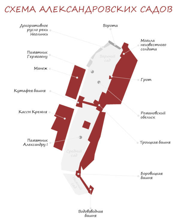 Александровский сад разместился за Иверскими воротами на склонах Боровицкого холма и проходит вдоль западной кремлевской стены: от Площади Революции до Кремлёвской набережной. Структурно он включает верхний, средний и нижний сад.