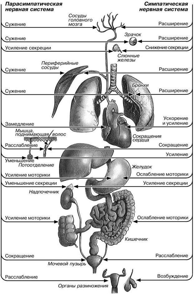 Преобладание парасимпатической нервной системы создает условия для «отдыха и восстановления организма» и напоминает состояние покоя, которое наступает после сытной еды. Зрачки сужаются, частота сердечных сокращений снижается, повышается приток крови к пищеварительному тракту, усиливаются продвижение пищи через кишечник и секреция пищеварительных ферментов, просвет дыхательных путей уменьшается. Парасимпатическая нервная система функционирует благодаря медиатору ацетилхолину.