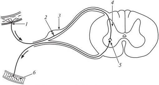 1 чувствительные рецепторы в коже; 2 чувствительный (афферентный) нейрон; 3 спинномозговой ганглий; 4 серое вещество спинного мозга; 5 двигательный (эфферентный) нейрон; 6 окончание двигательного волокна в мышце
