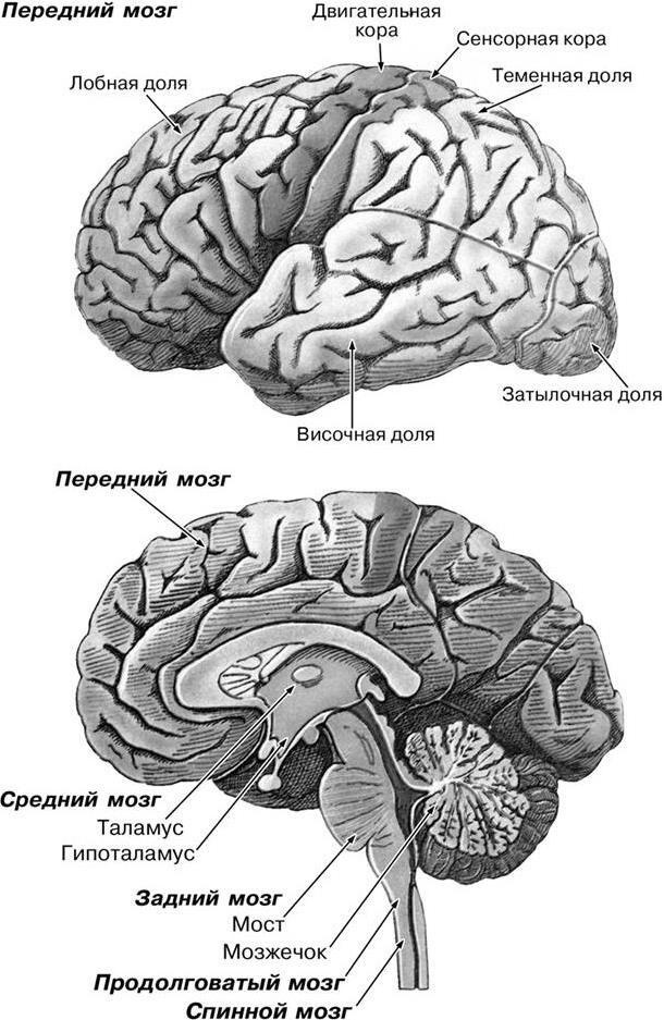Поверхностный слой полушарий кора, которая вместе с несколькими структурами, лежащими в глубине, составляет передний мозг. Также имеется промежуточный, средний, задний (мост и мозжечок) и продолговатый мозг (рис. 9).