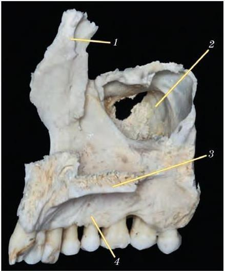 1 лобный отросток; 2 верхнечелюстная (гайморова) пазуха; 3 нёбный отросток; 4 альвеолярный отросток